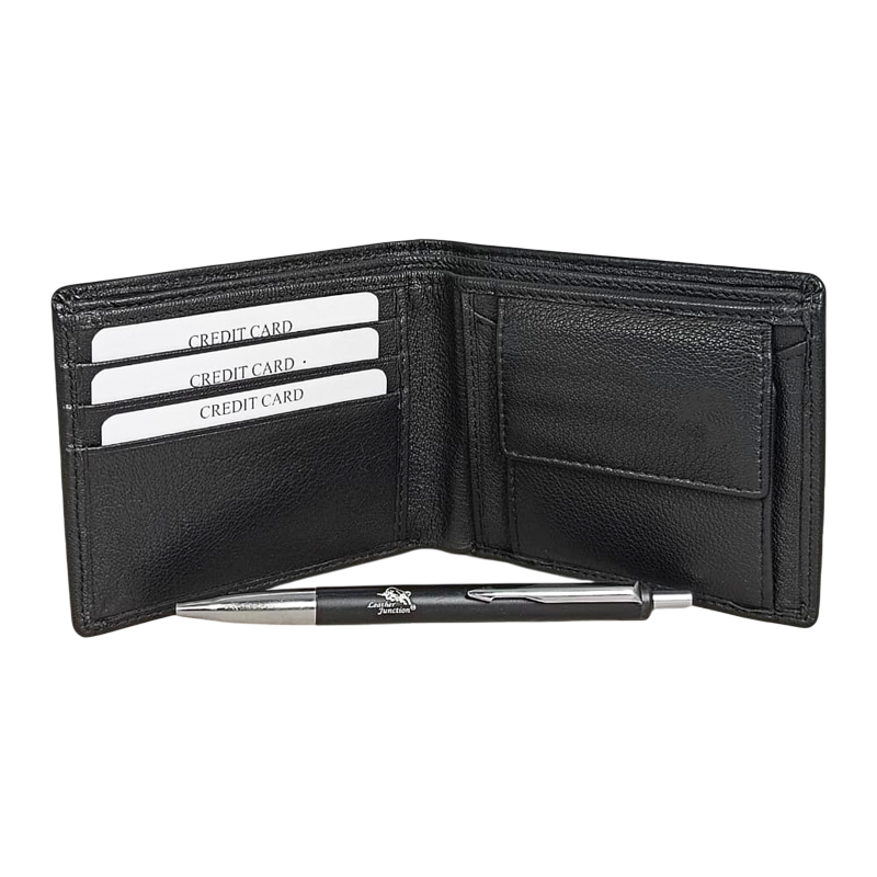 Crafted from 100% genuine leather, the wallet includes multiple card slots, spacious cash compartments, and a secure coin pocket, keeping your essentials organized. The black textured finish gives it a refined and professional look, while the pen adds a polished touch, making this set ideal for both personal use and gifting.