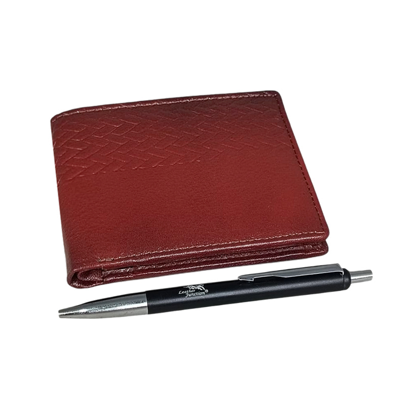 Make a bold statement with the Leather Junction® Genuine Leather Wallet & Pen Gift Set, crafted for men who value style, elegance, and utility. This premium set includes a Cognac textured bifold wallet with a unique woven pattern and a sleek black-silver ball pen, designed to complement your lifestyle.