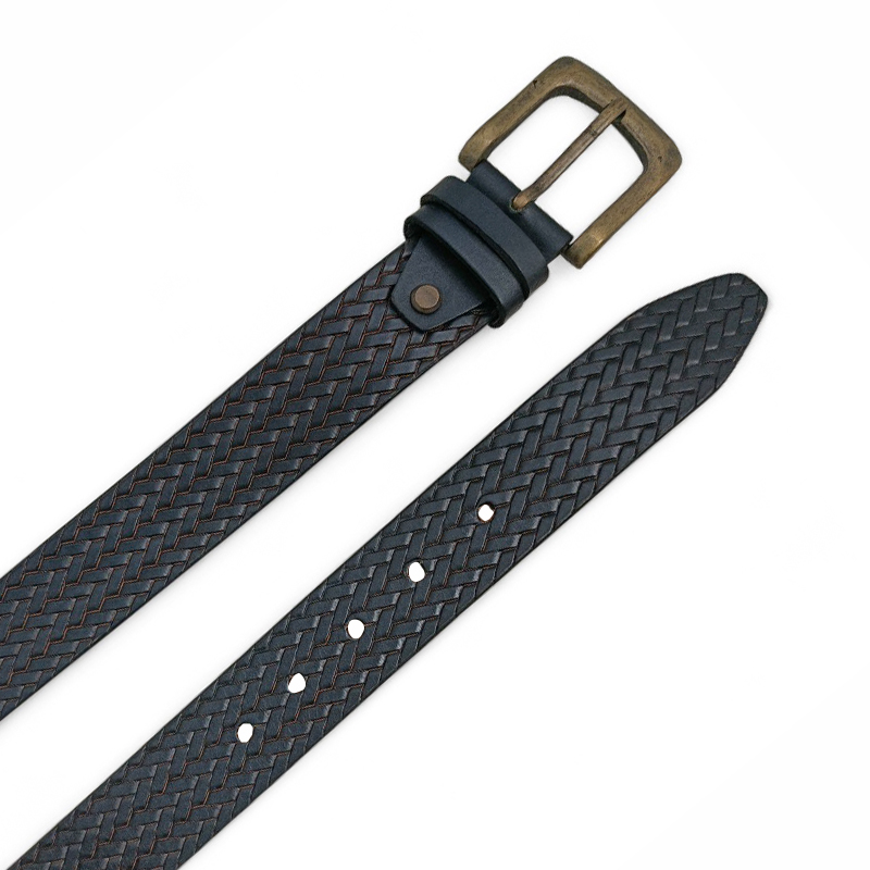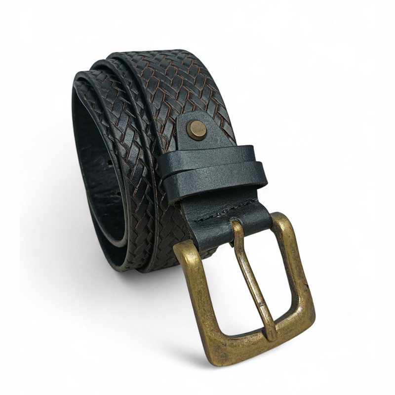 🧍 Textured Leather Belt: Embossed woven pattern with antique brass buckle — strong, adjustable, and stylish for everyday wear.