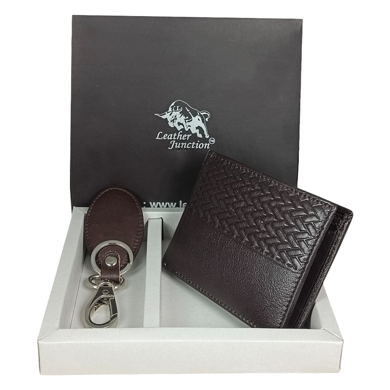 The bifold wallet comes with a textured finish on the exterior and a smooth leather body, offering a classy look. Inside, it includes multiple card slots, a coin pocket, and spacious compartments for cash, making it the perfect balance of fashion and functionality. The matching leather keychain with sturdy metal fittings ensures your keys are safe and easy to carry.