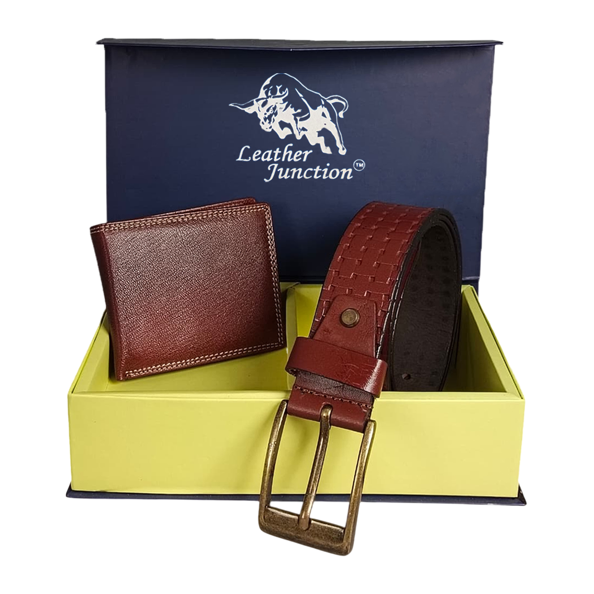 Elevate your everyday style with the Leather Junction™ Premium Tan Leather Wallet & Belt Combo Gift Set for Men, crafted from 100% genuine leather. Designed for the modern man, this combo blends durability, sophistication, and functionality — making it an essential wardrobe companion. The finely grained tan leather wallet offers multiple card slots, a coin pocket, and a secure bi-fold design, while the textured leather belt with a solid brass buckle complements both formal and casual attire.