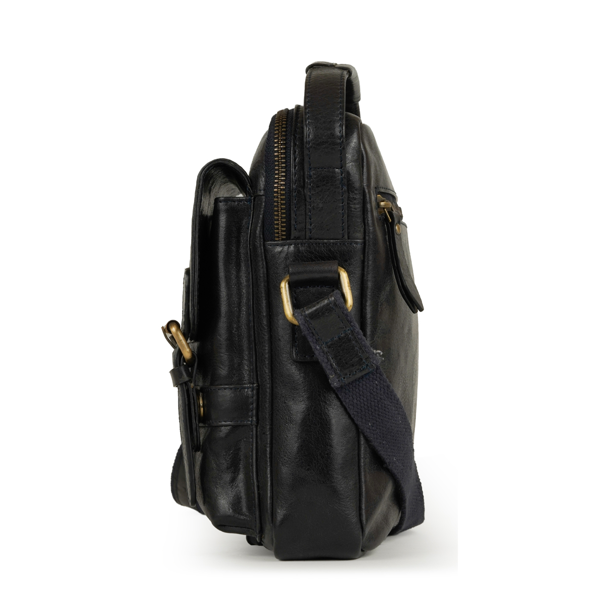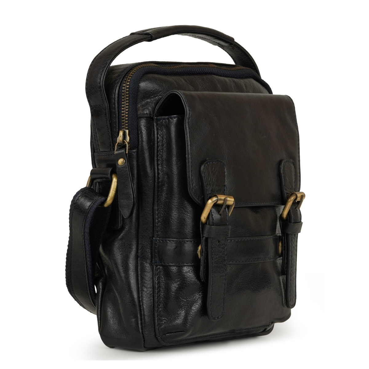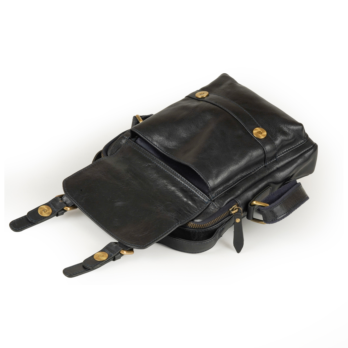 Secure Closure: Flap with brass buckle and zippered access for added protection.
