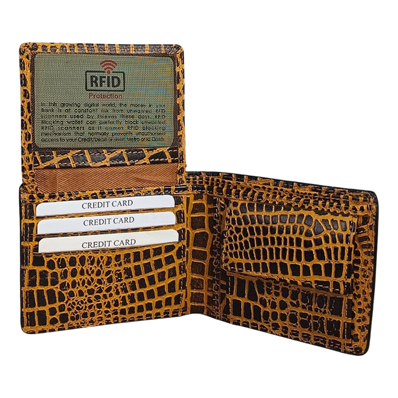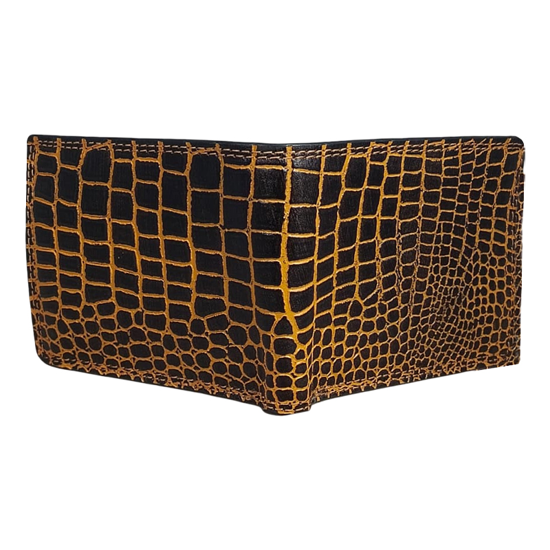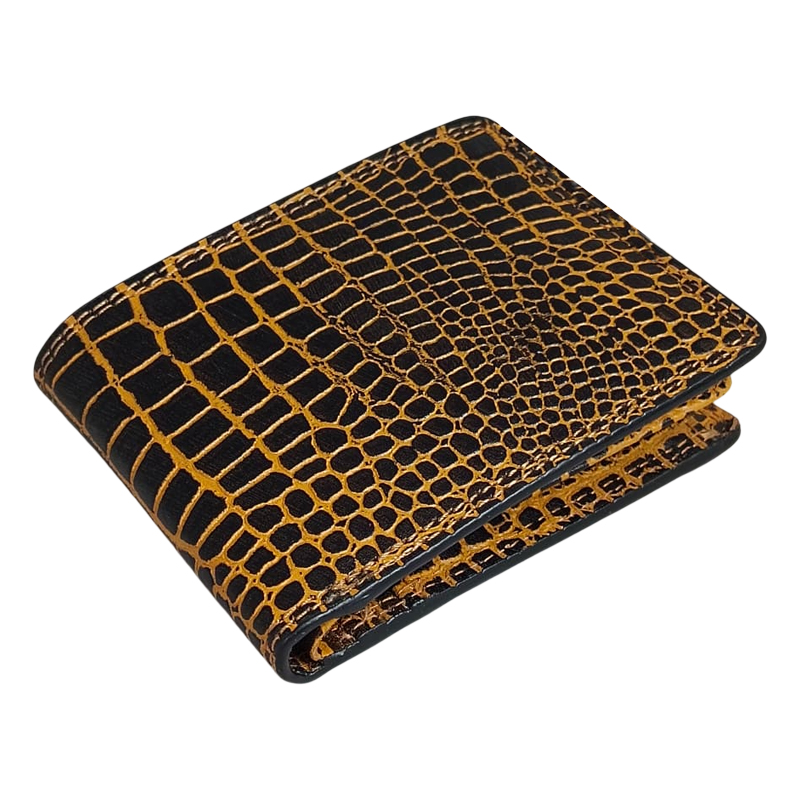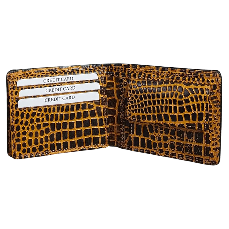 Make a bold style statement with this Premium Genuine Leather Men’s Wallet, featuring an eye-catching crocodile-textured design in rich brown and yellow tones. This wallet is crafted for men who value both fashion and functionality.