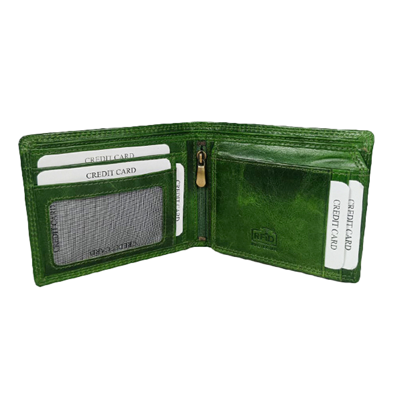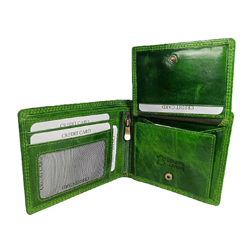 Add a splash of color to your everyday carry with this striking men genuine leather wallet in a vibrant green finish. Crafted from high-quality leather, this bi-fold wallet features a durable yet stylish design that stands out. It includes multiple credit card slots, a transparent ID window, and a convenient zippered coin pocket, offering ample storage for all your essentials. The soft, textured leather provides a luxurious feel while ensuring long-lasting use. Perfect for the modern man seeking a blend of functionality and bold style.