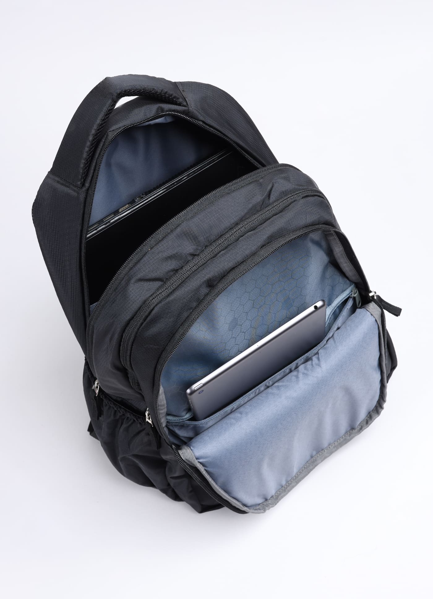 Padded back and shoulder straps::Top padded handle::Laptop Sleeve