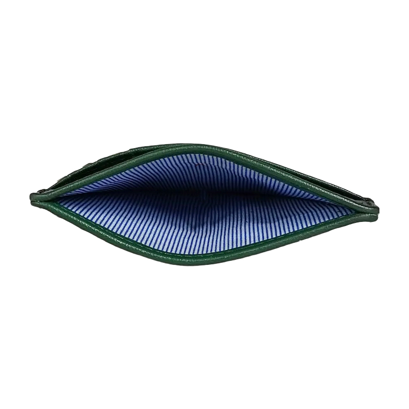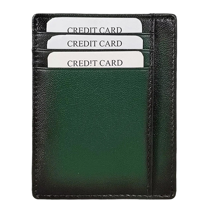 Elevate your everyday carry with this premium green leather card holder, crafted for style and functionality. This slim, RFID-blocking design ensures your cards are secure from unauthorized scans, while the durable leather construction offers long-lasting use. Featuring multiple slots, it provides ample space for your credit cards, IDs, and more, all in a compact form that fits seamlessly into your pocket. The elegant green finish with a blue striped interior adds a touch of sophistication to your accessories.