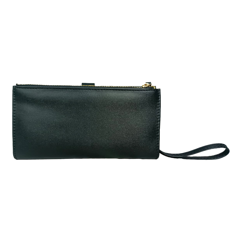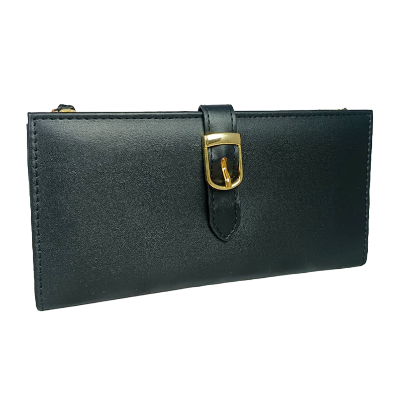 Discover sophistication with this black artificial leather zip-around wallet, designed for the modern woman. Featuring a luxurious leather exterior, a secure gold-tone buckle, and a convenient wrist strap, this clutch purse combines style with practicality. The interior offers multiple card slots, a zippered coin pocket, and spacious compartments, making it ideal for daily use or travel. Elegant Design: Luxurious black artificial leather with a gold-tone buckle and wrist strap for a sophisticated look.