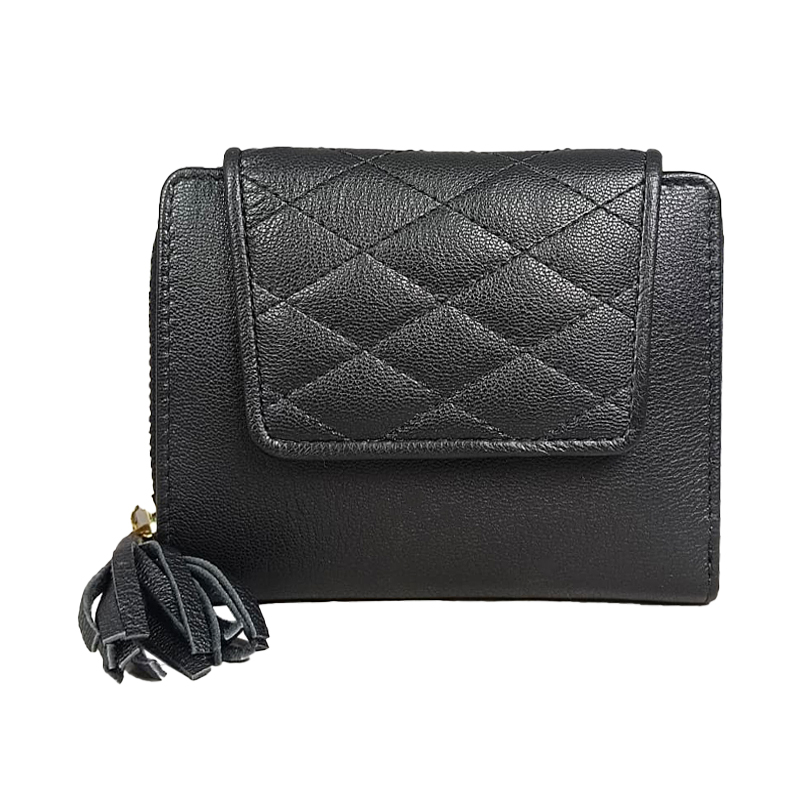 Sophisticated Black Quilted Leather Compact Wallet for Women - Ladies Purse RFID Blocking Zippered Organizer with Multiple Card Slots, Tassel Accent, and Secure Snap Closure - Perfect Everyday Essential and Gift